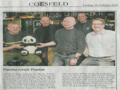 ...seit gut einem Jahr haben wir für unseren Namensgeber eine Patenschaft beim WWF übernommen. Im Rahmen des bekannten Getränkeaufschlages bei Live-Musik in der Kaffeemühle (20 cent pro Getränk), werden wir die Einnahmen ausschließlich unserem Panda spenden. Zudem hat das Team der Kaffeemühle extra einen schwarz-weißen „Pandaschnaps“ kreiert, von dem auch ein Drittel des Getränkepreises unserem Freund zukommt.Also, strengt Euch an und erscheint mit Durst . . . Wir freuen uns auf Euch !