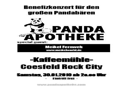 18.03.2009 WICHTIG! Das Konzert in der Kaffeemühle muss leider ausfallen. Insgesamt 10 Saiten der Panda Apotheke weilen diese Woche im Krankenhaus, so dass ein ordnungsgemäßer Ablauf, sprich Spaß und Musik ohne Ende einfach nicht gewährleistet ist. Wir wünschen von hier aus dem Carsten und dem Jochen gute Besserung und hoffen das Konzert bald nachholen zu können.