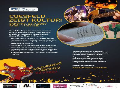 03.09.2007 Samstag in Billerbeck war klasse. Wir durften zwar erst spät, dafür aber vor interessiertem und fachkundigem Publikum ran. Unsere neue PA ist auch endlich da. Zu bestaunen wird sie Sonntag, dem 16.09. in Ahaus an der BBS sein. Ab 13 Uhr sind wir da am Tag der offenen Tür für euch da. Un d schon eine Woche später ist wie schon angekündigt Kulturnacht in Coesfeld. Da werden wir an gewohnter Stelle bei Kurt in der Kaffeemühle rocken bis der Arzt vom nicht weit entfernten Krankenhaus, ach ihr wisst schon....